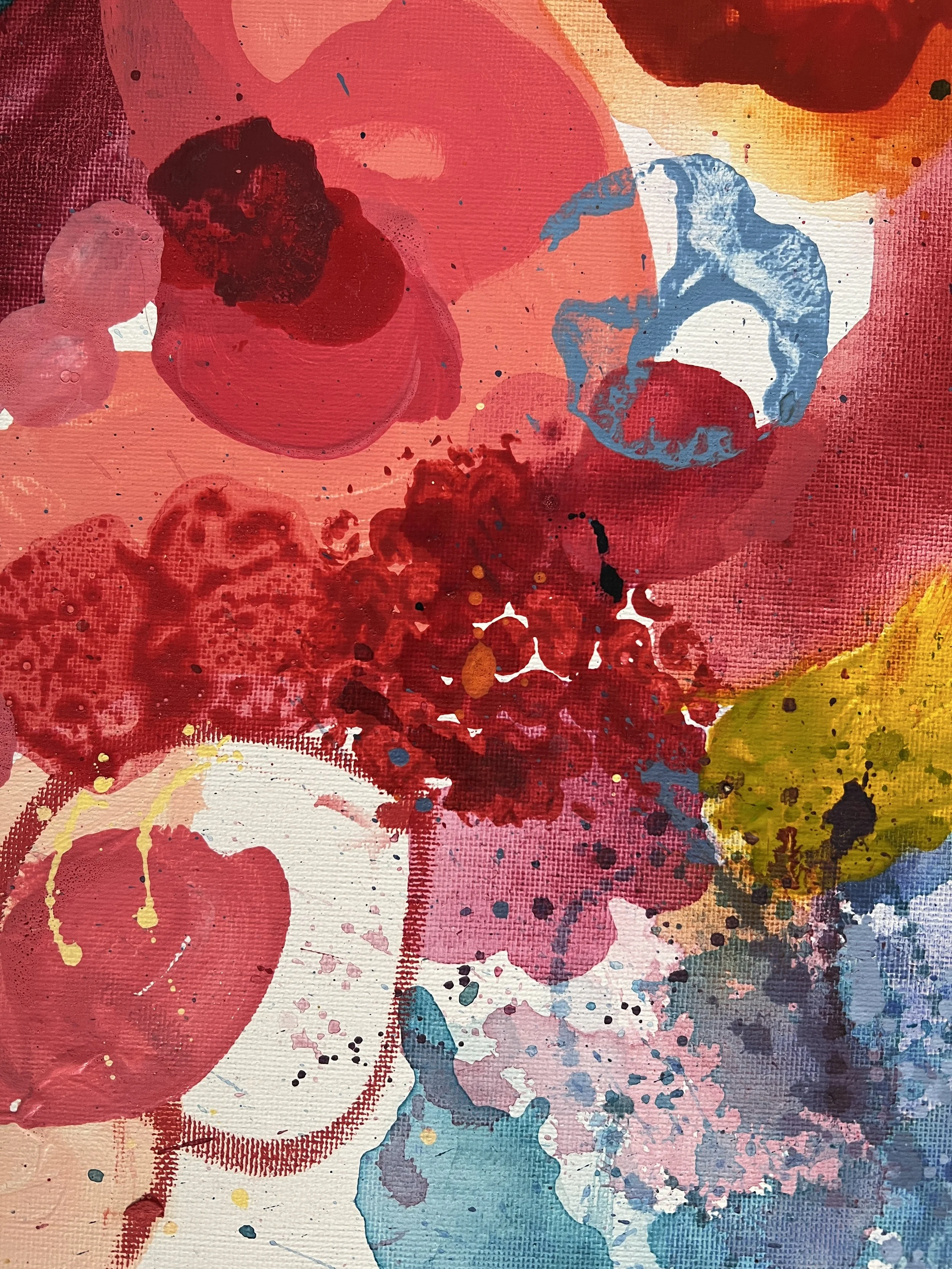 Als ich diese Leinwände malte, passierte mir ein Missgeschick – ich kippte versehentlich ein Glas Wasser über eines der Werke, das auf dem Boden lag. Zunächst war ich wenig erfreut, doch schnell bemerkte ich, dass dieses Unglück erstaunliche Effekte hervorgebracht hatte! Es entstand eine dynamische Bewegung auf der Leinwand, mit Tropfen in verschiedenen Größen, die das Bild durchzogen. Ich begann, dies weiter zu erforschen. Diese Werke vermitteln ein Gefühl von frischem, spontanen Bewegungsdrang.