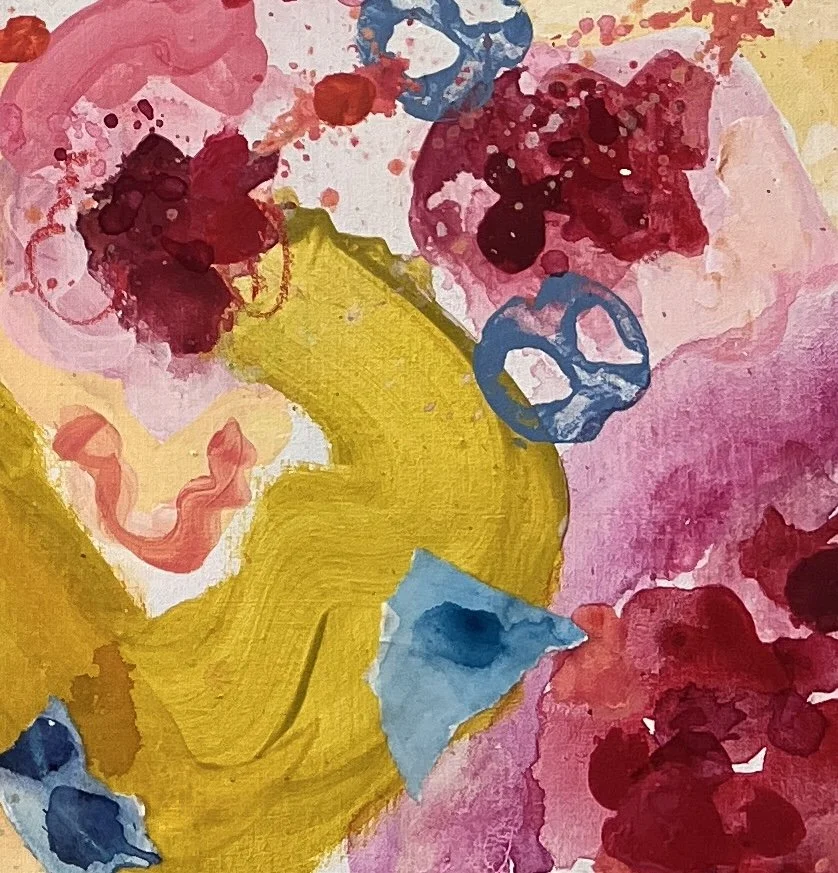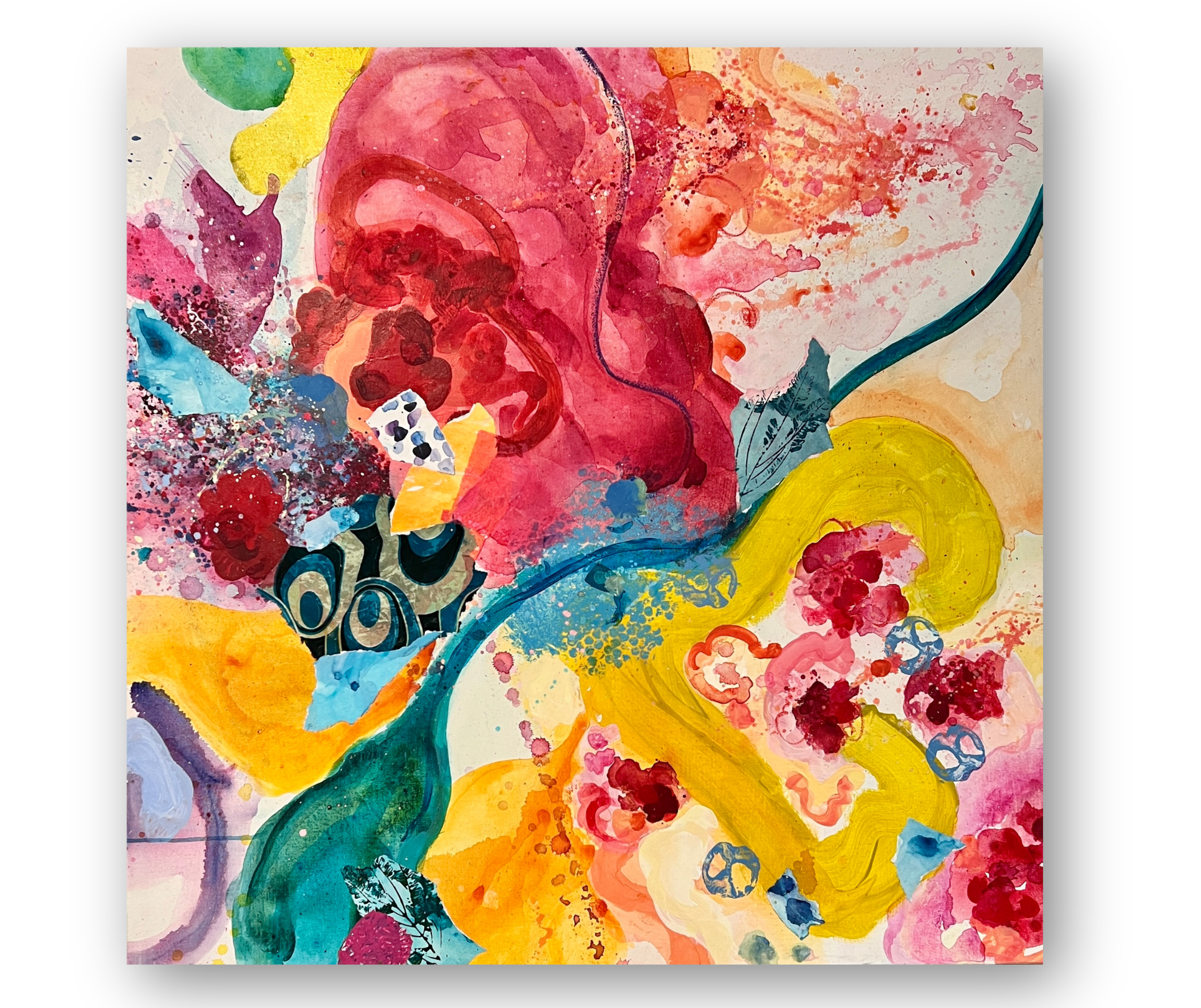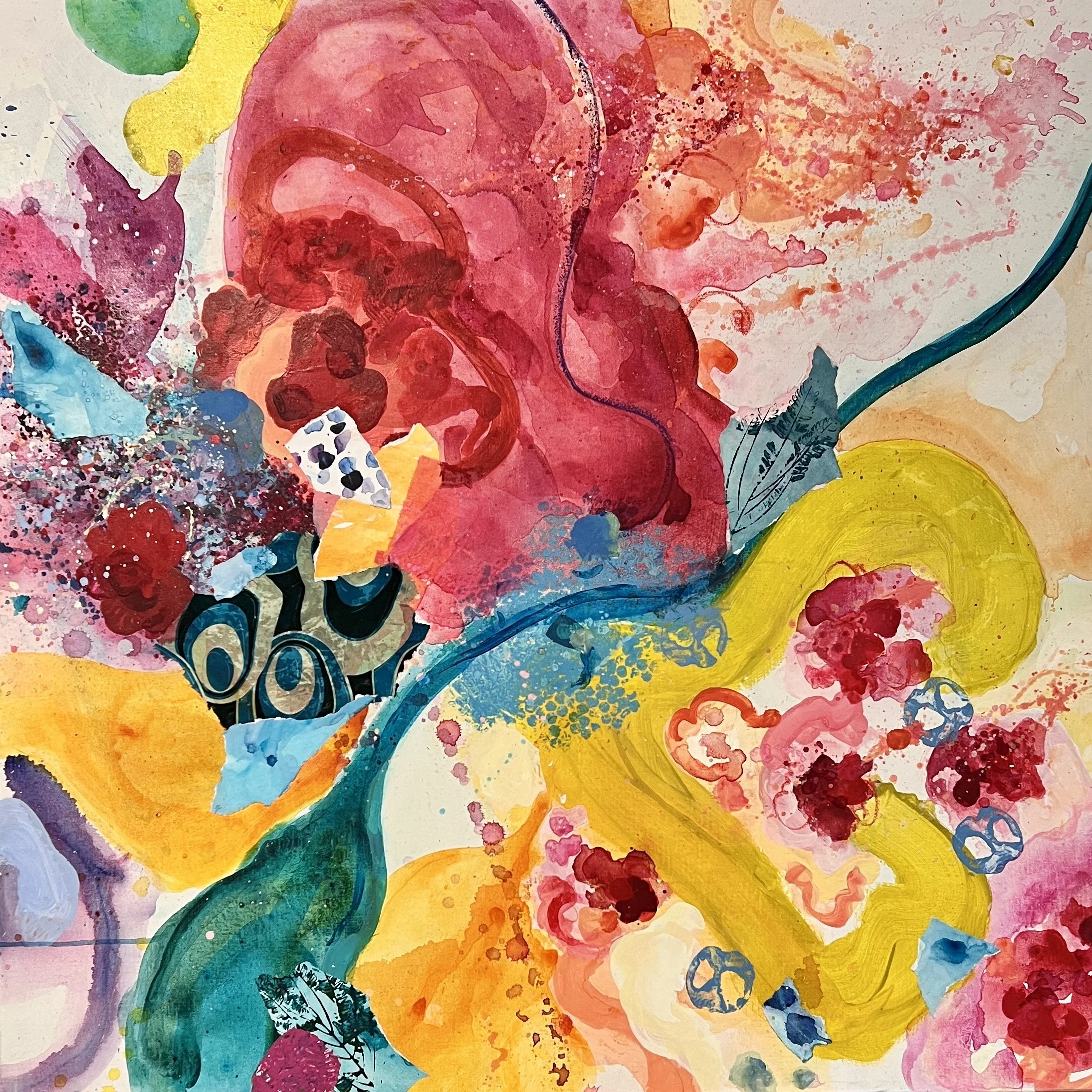 Die geschwungenen Linien und sich überlagernden Farbflächen symbolisieren die fließende Dynamik des Lebens, in dem Höhen und Tiefen, Leichtigkeit und Schwere miteinander verwoben sind. Die verschiedenen Texturen und Details – wie die Sprenkel und Collage-Elemente – verleihen dem Bild eine zusätzliche Dimension und betonen die Vielfalt und Tiefe der Lebenserfahrungen.