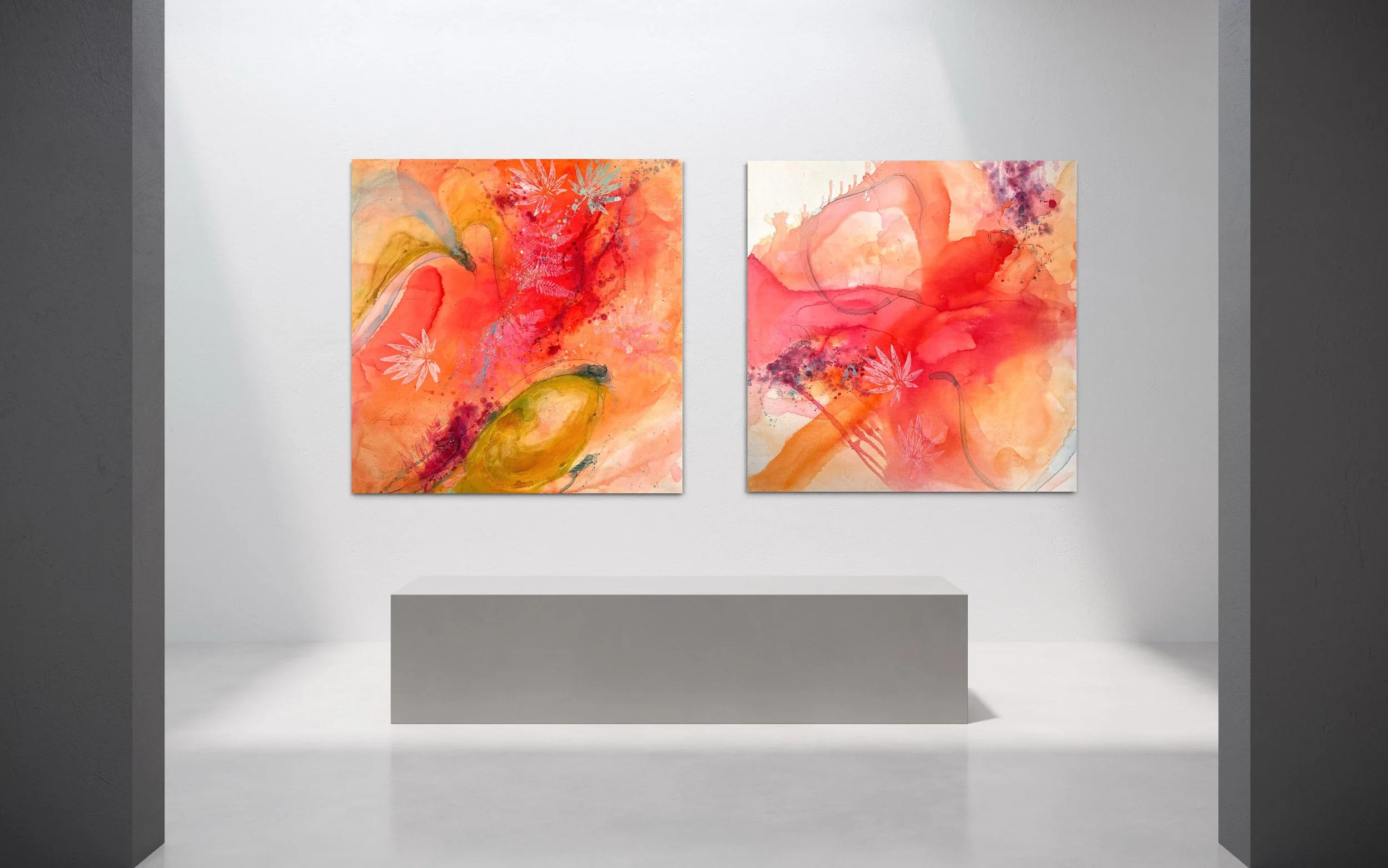 Die zarten Orangentöne, die vollen Orange- und Rosatöne verleihen den Werken Warmherzigkeit, während die dynamischen Pinselstriche Energie und Lebendigkeit ausdrücken. Diese Bilder sollen dich daran erinnern, dich immer wieder mit dem Genuss und der Freude des Lebens zu verbinden – mit dem Moment, der Wärme und dem Licht, die wir im Alltag so leicht vergessen.