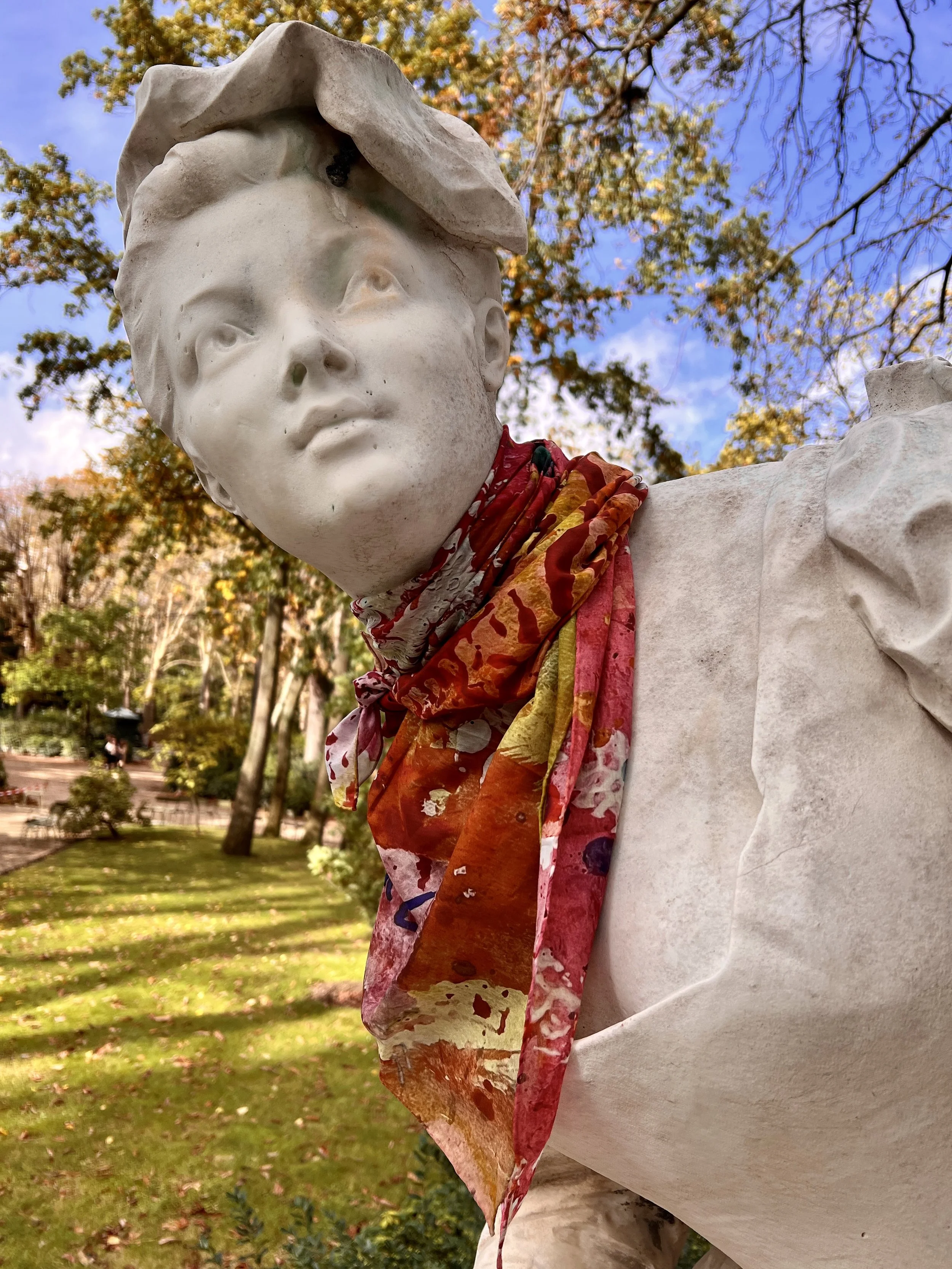 Le foulard "Comme un souffle du bonheur" célèbre la beauté de la nature et la douceur des moments de paix. Ses nuances de rouge, orange, jaune et vert pétillant rappellent un coucher de soleil d'été et insufflent une fraîcheur vivifiante. Plus qu'un ornement, il incarne la grâce intérieure et la joie profonde, comme l'a exprimé Thich Nhat Hanh : "Dans chaque nuance, réside une parcelle de bonheur."